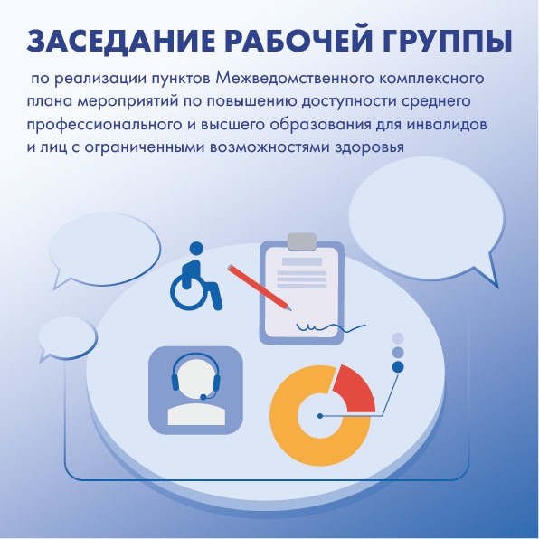 Состоялось первое заседание рабочей группы по реализации пунктов Межведомственного комплексного плана мероприятий по повышению доступности среднего профессионального и высшего образования для инвалидов и лиц с ограниченными возможностями здоровья. На заседании обсудили ход реализации мероприятий плана в первом полугодии 2022 года в рамках деятельности образовательных организаций среднего профессионального и высшего образования, реализующих инклюзивное образование, а также меры содействия трудоустройству выпускников с инвалидностью.
