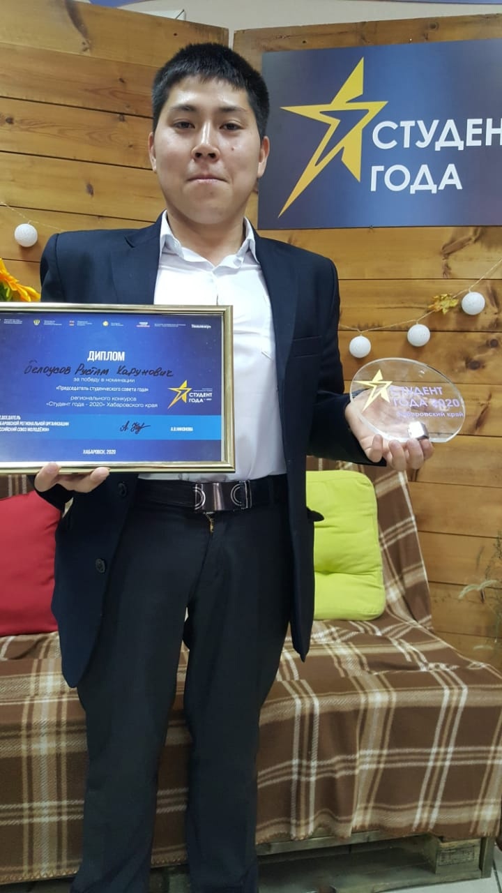 Активное участие в жизни группы и техникума, общественные дела и участие в мероприятиях не стали помехой на пути к получению знаний и высоким результатам успеваемости. Рустам на федеральном уровне признан лучшим студентом – лидером олимпиадного движения в техникуме и на протяжении всего обучения получал стипендию Губернатора Хабаровского края для ребят, относящихся к коренным малочисленным народам Севера.