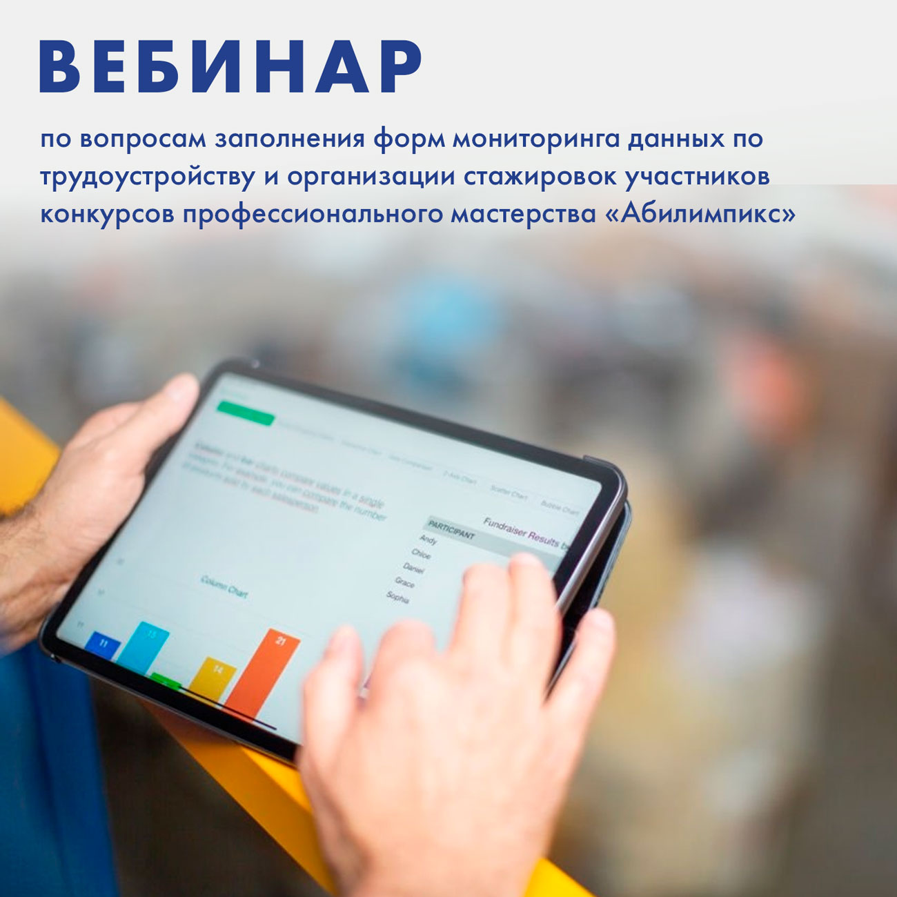 28 апреля 2022 года в 10.00 (мск) состоится вебинар по вопросам заполнения форм мониторинга данных по трудоустройству и организации стажировок участников конкурсов профессионального мастерства «Абилимпикс» в информационной системе https://abilympics-russia.ru/.