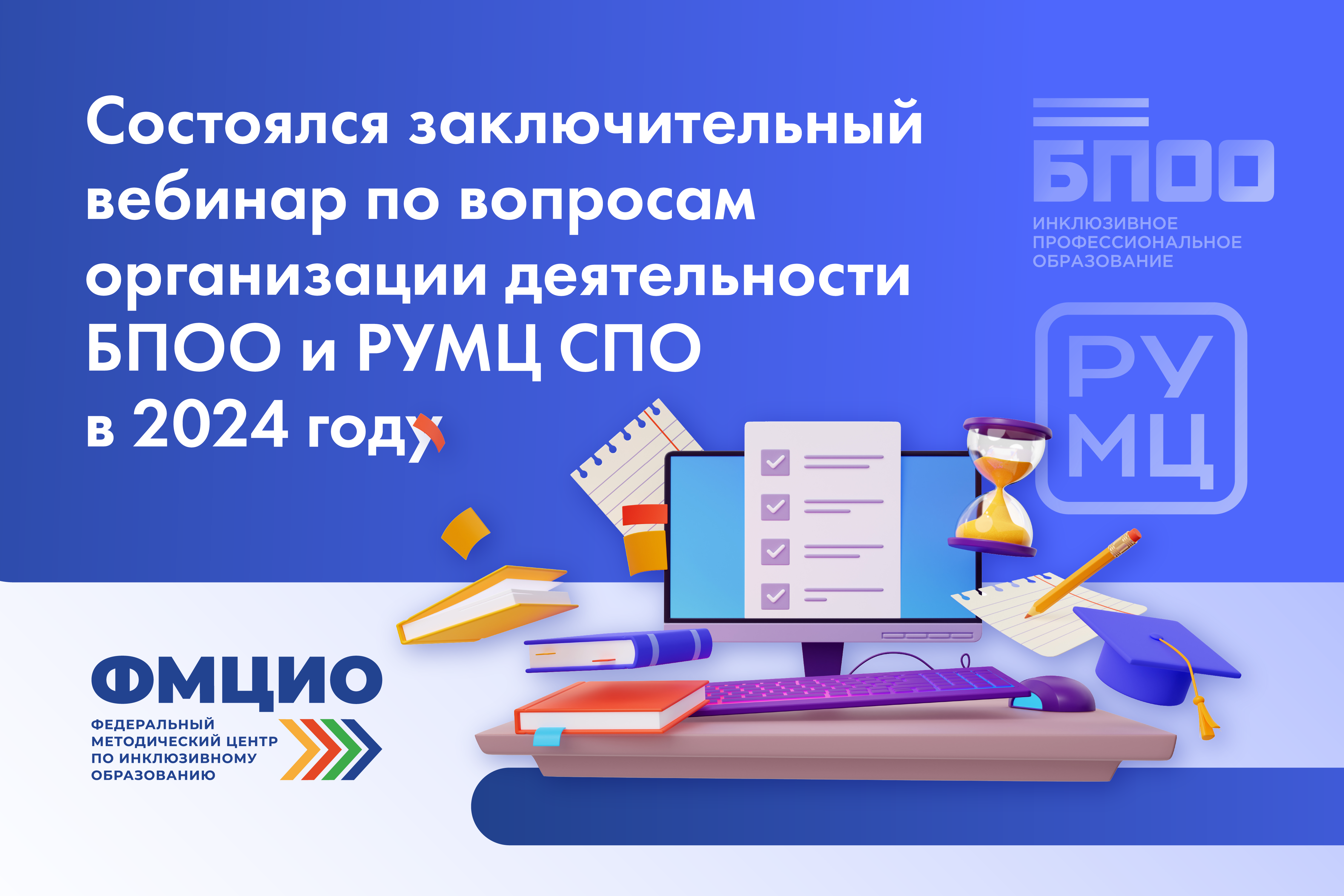 Федеральным методическим центром по инклюзивному образованию Института развития профессионального образования с целью координации работы в 2024 году проведен ряд вебинаров по вопросам организации деятельности базовых профессиональных образовательных организаций и ресурсных учебно-методических центров в системе среднего профессионального образования. 19 декабря был проведен заключительный вебинар текущего года.