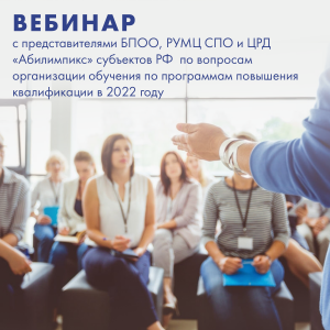 ФМЦИО приглашает представителей БПОО, РУМЦ СПО и ЦРД «Абилимпикс» субъектов Российской Федерации принять участие в вебинаре по вопросам организации обучения по программам повышения квалификации в 2022 году.