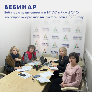 13 января 2022 года состоялось рабочее совещание в формате вебинара с представителями БПОО и РУМЦ СПО по вопросам организации деятельности в 2022 году, в том числе обеспечения профессиональными образовательными организациями (ПОО) условий доступности для инвалидов и лиц с ограниченными возможностями здоровья объектов и предоставляемых услуг в сфере образования.
